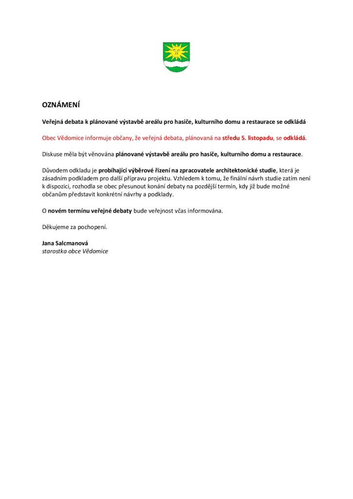 Veřejná debata k plánované výstavbě areálu pro hasiče, kulturního domu a restaurace se odkládá.